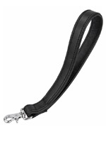 Die kurze Führleine in klassischem Schwarz ist aus echtem Leder gefertigt und überzeugt durch hochwertige Verarbeitung. Die umgenähten Kanten verleihen Stabilität und Langlebigkeit, während der praktische Karabinerhaken ein einfaches Einklinken ermöglicht.